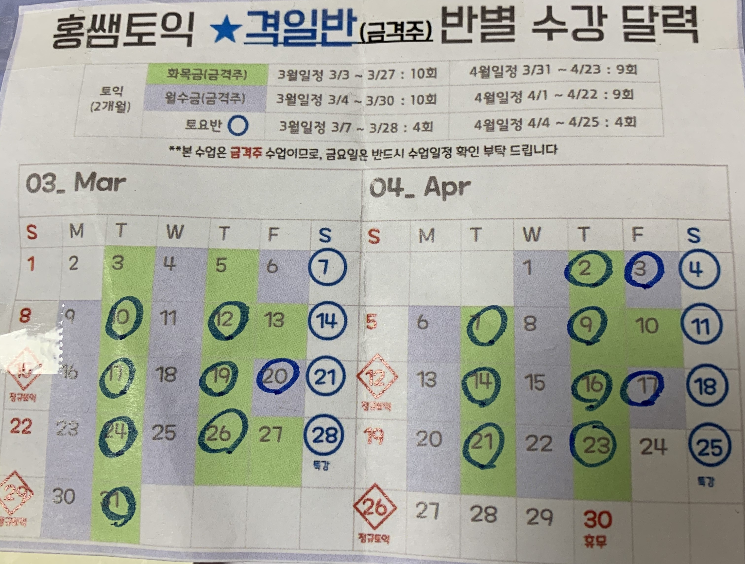학원에서 주신 수강 달력으로 체크하려했는데 헷갈려서요ㅠㅠ