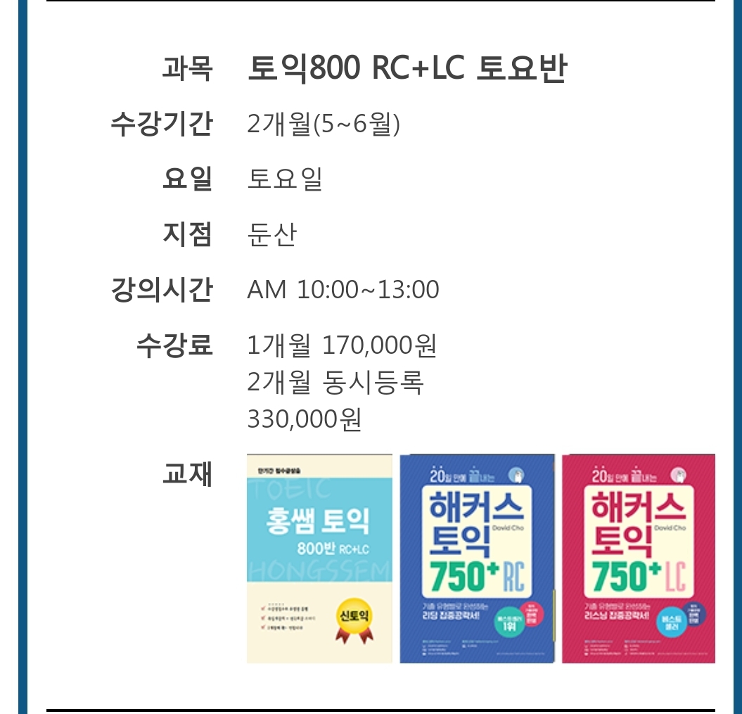 아래 5-6월 토익 800 토요반 수강 신청 언제부터이고 언지부터 수업 시작해서 언제 끝나나요?